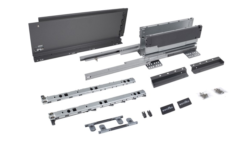 СТАРТ PUSH+SOFT SB40 — комплект систем выдвижения для сборки высокого выдвижного ящика с прямыми боковинами высотой 167 мм для мебели без ручек с открытием от нажатия и плавным доведением.