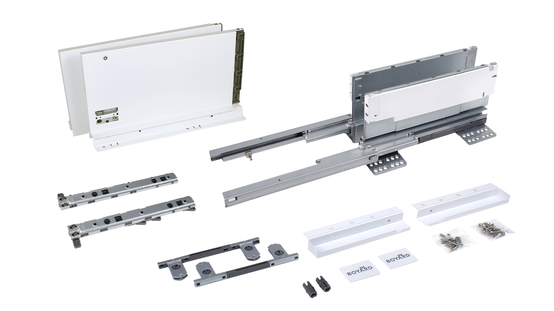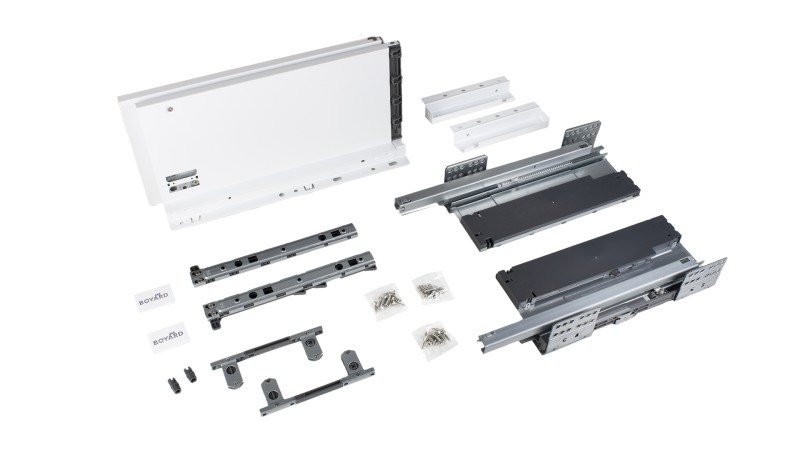 Для сборки выдвижного мебельного ящика на базе СТАРТ PUSH+SOFT SB40 необходимо самостоятельно изготовить фасад, заднюю стенку и дно мебельного ящика. Дополнительные рейлинги позволяют увеличить полезную высоту боковых стенок выдвижного ящика. Рейлинги и держатели к ним приобретаются отдельно.