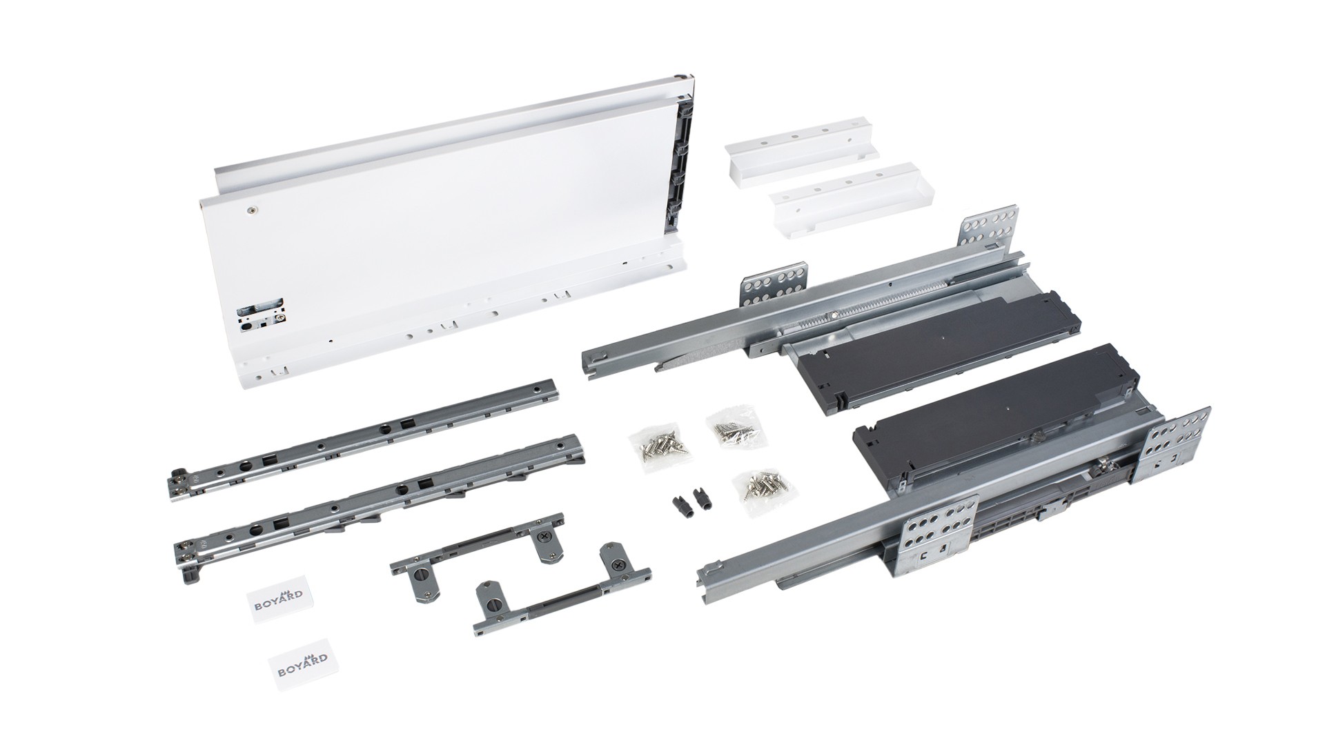 Для сборки выдвижного мебельного ящика на базе СТАРТ PUSH+SOFT SB40 необходимо самостоятельно изготовить фасад, заднюю стенку и дно мебельного ящика. Дополнительные рейлинги позволяют увеличить полезную высоту боковых стенок выдвижного ящика. Рейлинги и держатели к ним приобретаются отдельно.