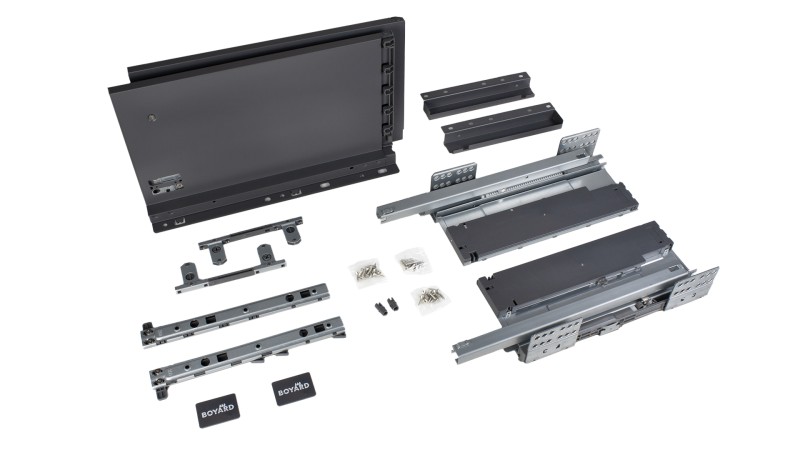 СТАРТ PUSH+SOFT SB41 — комплект систем выдвижения для сборки экстра-высокого выдвижного ящика с прямыми боковинами высотой 199 мм для мебели без ручек с открытием от нажатия и плавным доведением.
