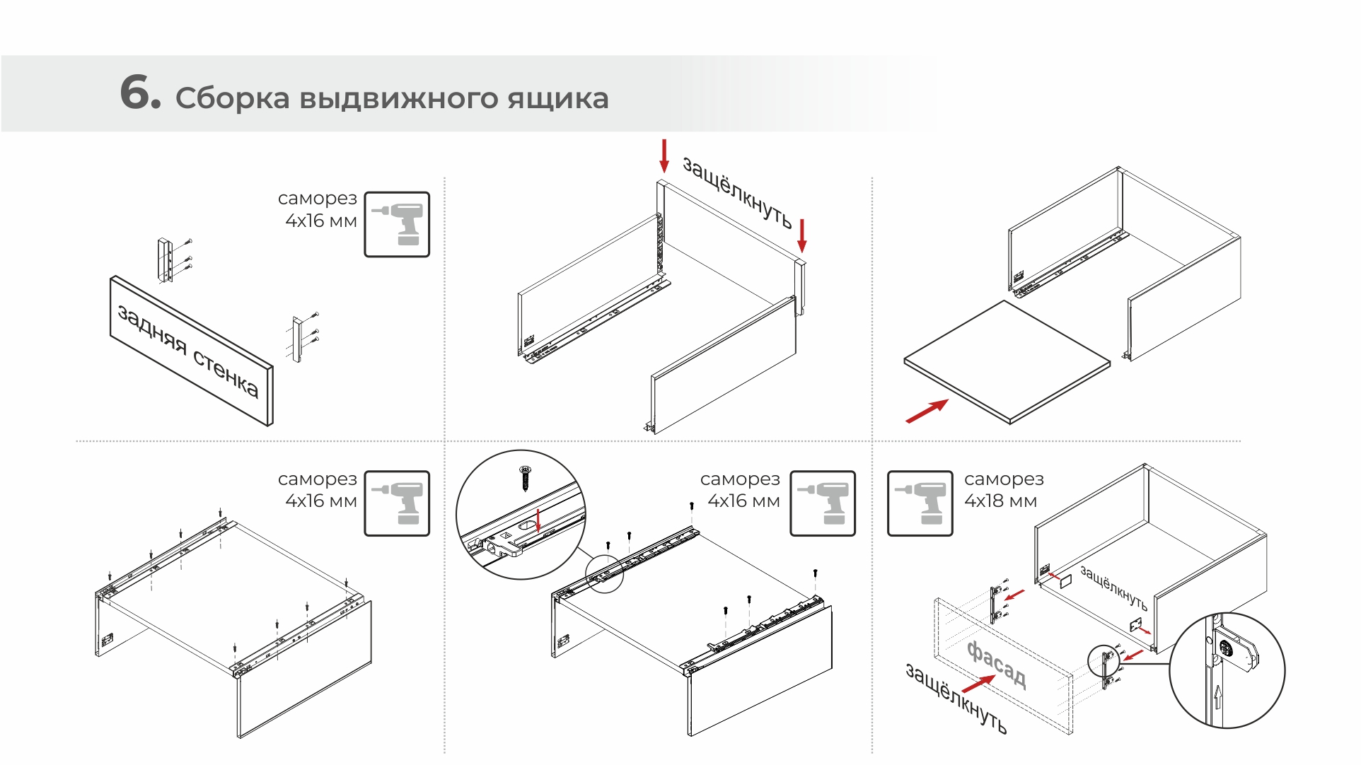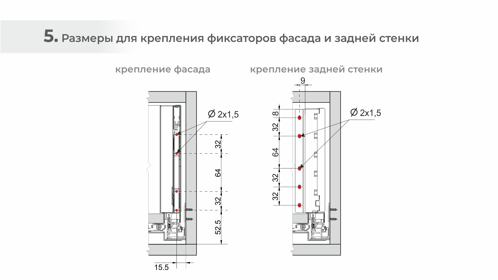 - Фиксаторы фасада с саморезами (левый и правый)