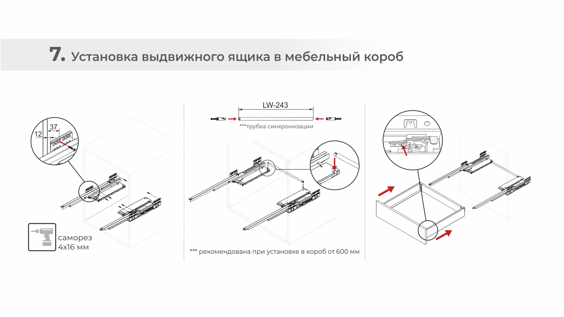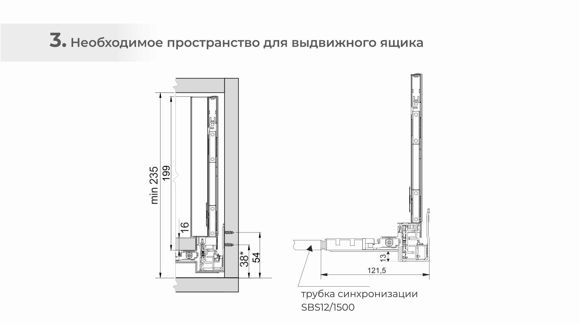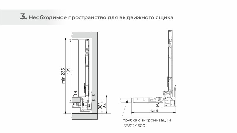 При создании габаритных мебельных ящиков шириной от 600 мм рекомендуется использовать поворотно-синхронизирующую трубку SBS12. Держатели для трубки представлены в комплекте СТАРТ PUSH+SOFT SB41, а SBS12 приобретается отдельно.