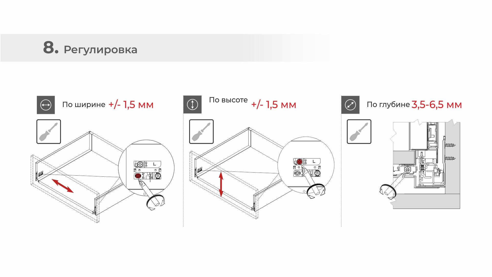 СТАРТ PUSH+SOFT допускает регулировку фасада по ширине и высоте на +/- 1,5 мм.