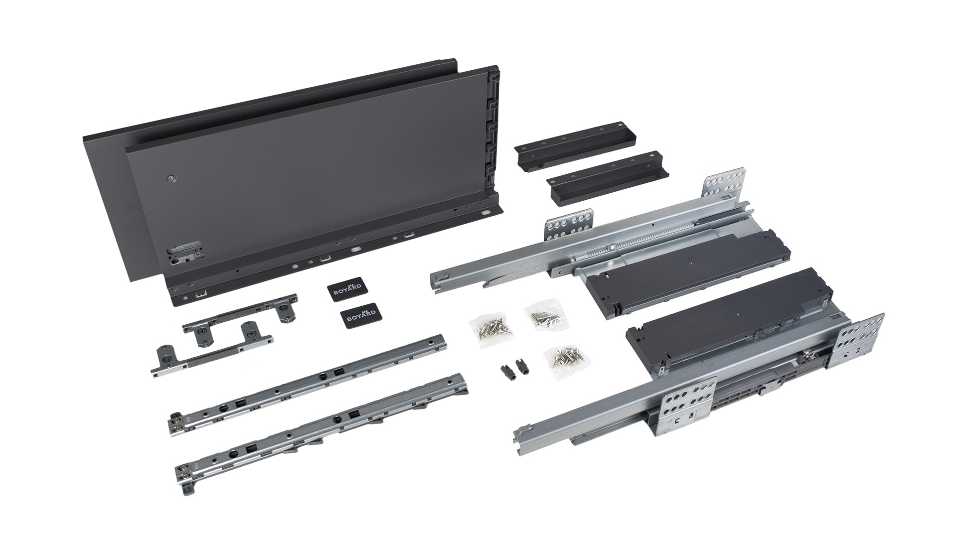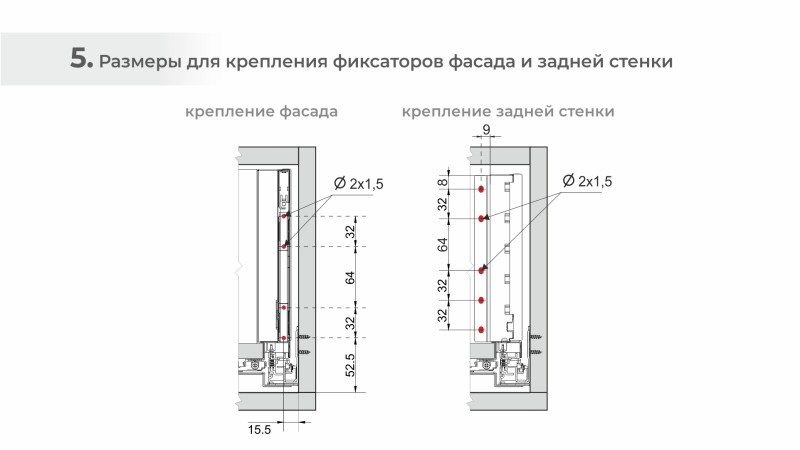 Для сборки выдвижного мебельного ящика на базе СТАРТ PUSH+SOFT SB41 необходимо самостоятельно изготовить фасад, заднюю стенку и дно мебельного ящика. Дополнительные рейлинги позволяют увеличить полезную высоту боковых стенок выдвижного ящика. Рейлинги и держатели к ним приобретаются отдельно.
