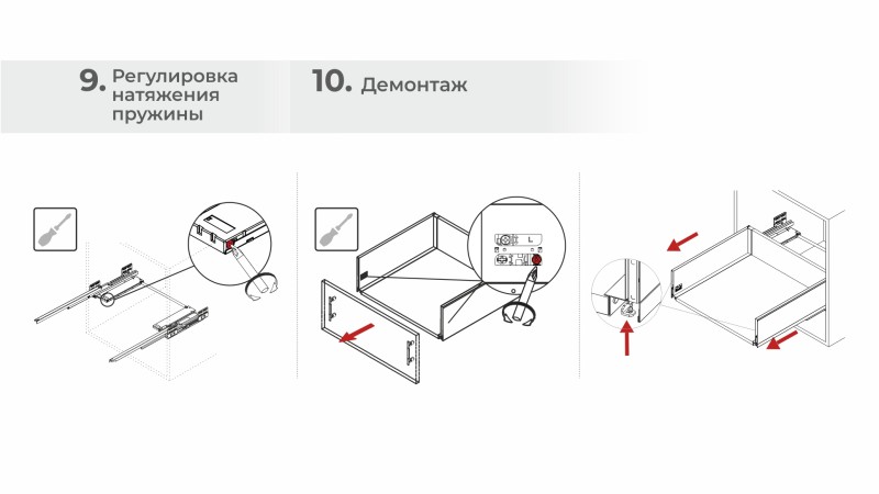 Регулировочный винт в механизме PUSH корректирует параметр усилия на открывание, который зависит от весогабаритных характеристик выдвижного модуля и степени его загрузки.