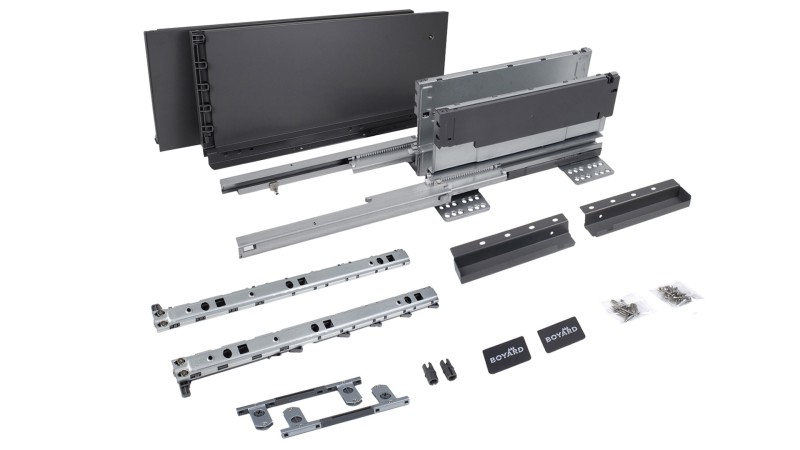 СТАРТ PUSH+SOFT SB41 — комплект систем выдвижения для сборки экстра-высокого выдвижного ящика с прямыми боковинами высотой 199 мм для мебели без ручек с открытием от нажатия и плавным доведением.