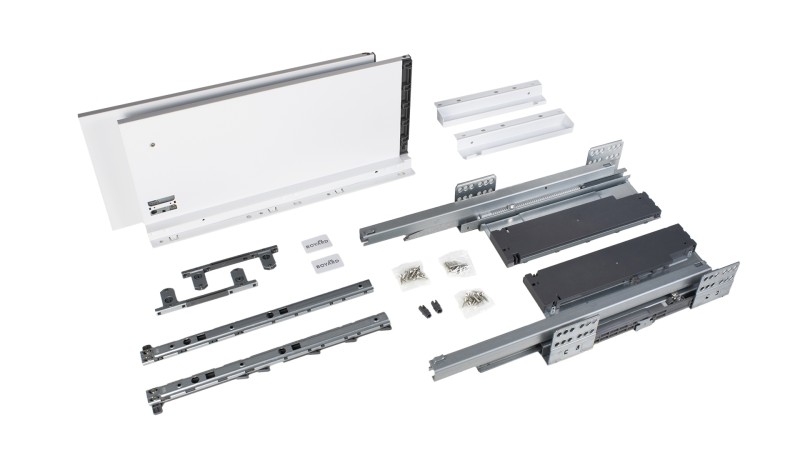 Для сборки выдвижного мебельного ящика на базе СТАРТ PUSH+SOFT SB41 необходимо самостоятельно изготовить фасад, заднюю стенку и дно мебельного ящика. Дополнительные рейлинги позволяют увеличить полезную высоту боковых стенок выдвижного ящика. Рейлинги и держатели к ним приобретаются отдельно.