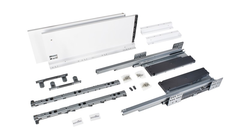 СТАРТ PUSH+SOFT SB41 — комплект систем выдвижения для сборки экстра-высокого выдвижного ящика с прямыми боковинами высотой 199 мм для мебели без ручек с открытием от нажатия и плавным доведением.