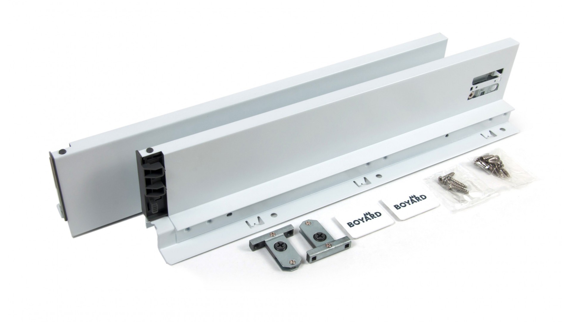 Боковины с держателями задней стенки и фиксаторами фасада выполняют защитно-декоративную функцию, а также соединяют между собой основные элементы выдвижного ящика: передняя фасадная панель, задняя стенка и дно. Кроме этого, боковины выполняют функцию регулировки фасада выдвижного ящика, функцию подвижного крепления выдвижного ящика к опорной направляющей скрытого монтажа DB8181, предварительно установленной на боковой стенке непосредственно мебельного изделия и защищают от непреднамеренного снятия при полном выдвижении механизма. Боковые стенки SBDW11, покрытые порошковой эмалью методом распыления с последующей сушкой при температуре 90 градусов, прослужат весь эксплуатационный срок, даже в условиях агрессивной кухонной среды. В комплект также входят декоративные заглушки с логотипом BOYARD.