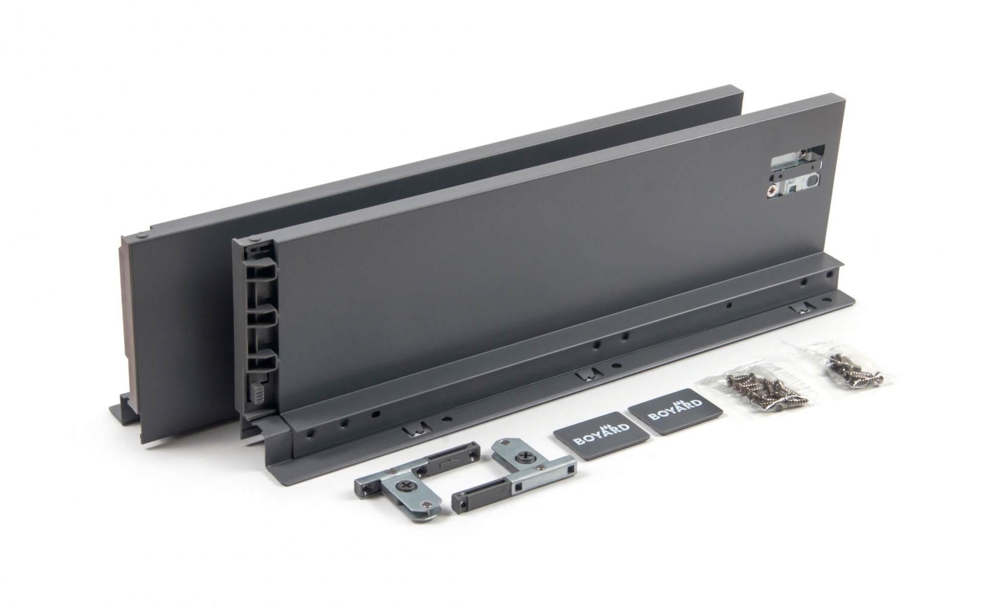 Боковины с держателями задней стенки и фиксаторами фасада выполняют защитно-декоративную функцию, а также соединяют между собой основные элементы выдвижного ящика: передняя фасадная панель, задняя стенка и дно. Кроме этого, боковины выполняют функцию регулировки фасада выдвижного ящика, функцию подвижного крепления выдвижного ящика к опорной направляющей скрытого монтажа DB8181, предварительно установленной на боковой стенке непосредственно мебельного изделия и защищают от непреднамеренного снятия при полном выдвижении механизма. Боковые стенки SBDW12, покрытые порошковой эмалью методом распыления с последующей сушкой при температуре 90 градусов, прослужат весь эксплуатационный срок, даже в условиях агрессивной кухонной среды. В комплект также входят декоративные заглушки с логотипом BOYARD.