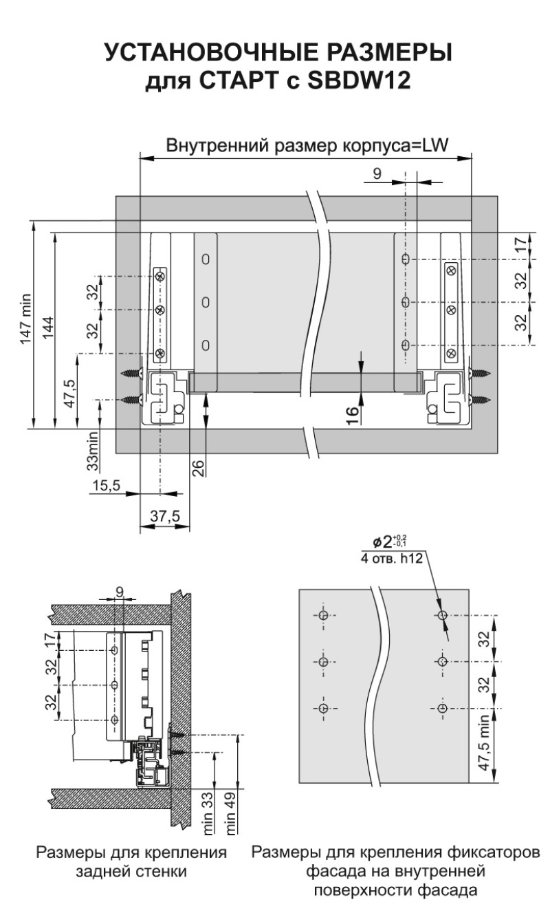 Для сборки выдвижного мебельного ящика с помощью боковин SBDW12 необходимо самостоятельно изготовить фасад, заднюю стенку и дно ящика с учетом собственных пожеланий и потребностей по ширине и высоте готового ящика.
