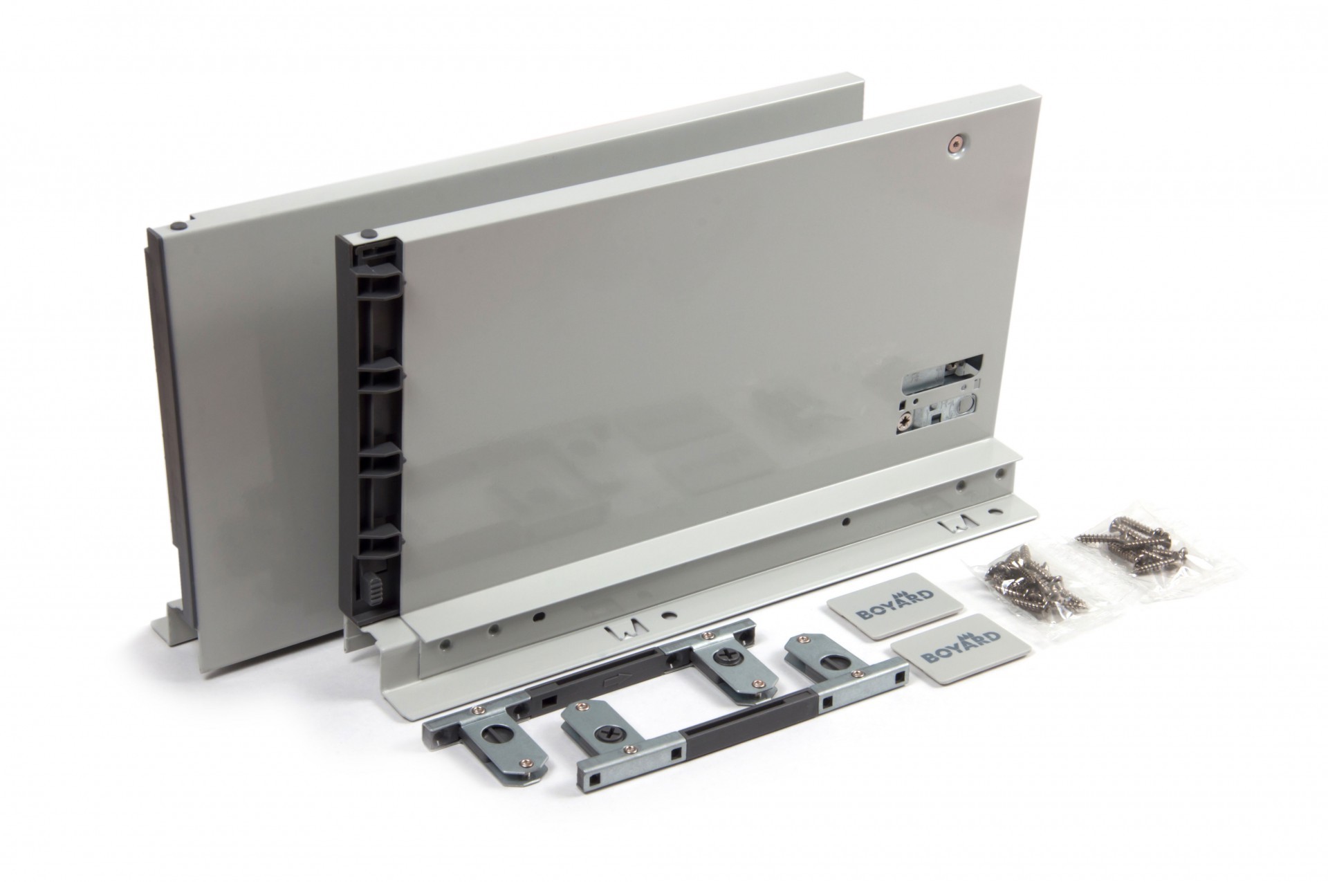 Боковины с держателями задней стенки и фиксаторами фасада выполняют защитно-декоративную функцию, а также соединяют между собой основные элементы выдвижного ящика: передняя фасадная панель, задняя стенка и дно. Кроме этого, боковины выполняют функцию регулировки фасада выдвижного ящика, функцию подвижного крепления выдвижного ящика к опорной направляющей скрытого монтажа DB8181, предварительно установленной на боковой стенке непосредственно мебельного изделия и защищают от непреднамеренного снятия при полном выдвижении механизма. Боковые стенки SBDW13, покрытые порошковой эмалью методом распыления с последующей сушкой при температуре 90 градусов, прослужат весь эксплуатационный срок, даже в условиях агрессивной кухонной среды. В комплект также входят декоративные заглушки с логотипом BOYARD.