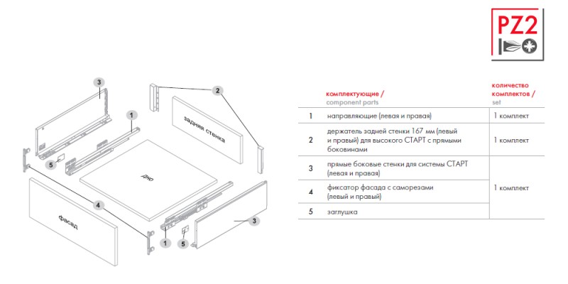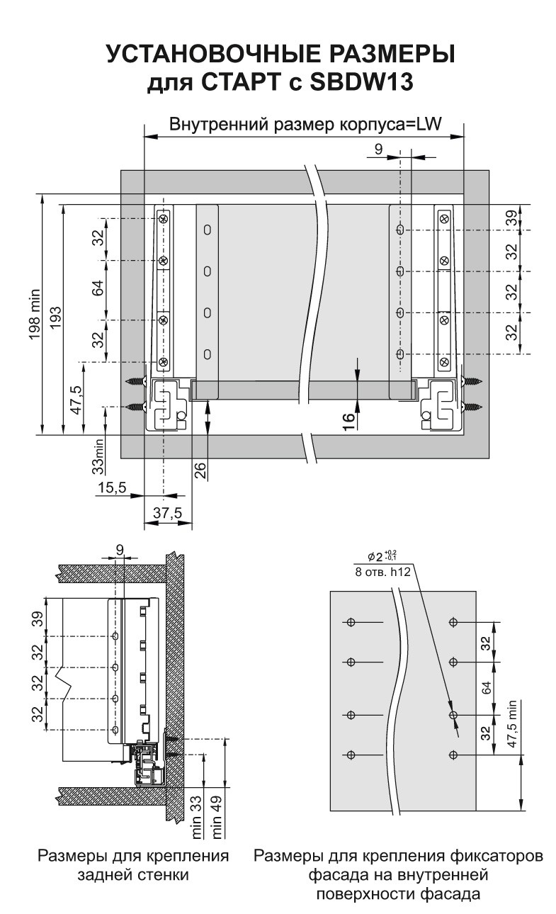 Для сборки выдвижного мебельного ящика с помощью боковин SBDW13 необходимо самостоятельно изготовить фасад, заднюю стенку и дно ящика с учетом собственных пожеланий и потребностей по ширине и высоте готового ящика.