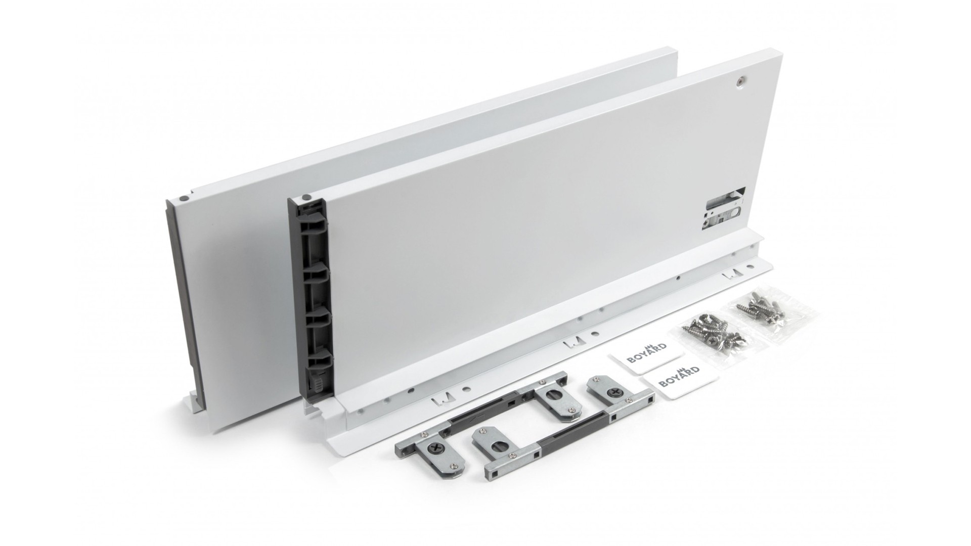 Боковины с держателями задней стенки и фиксаторами фасада выполняют защитно-декоративную функцию, а также соединяют между собой основные элементы выдвижного ящика: передняя фасадная панель, задняя стенка и дно. Кроме этого, боковины выполняют функцию регулировки фасада выдвижного ящика, функцию подвижного крепления выдвижного ящика к опорной направляющей скрытого монтажа DB8181, предварительно установленной на боковой стенке непосредственно мебельного изделия и защищают от непреднамеренного снятия при полном выдвижении механизма. Боковые стенки SBDW13, покрытые порошковой эмалью методом распыления с последующей сушкой при температуре 90 градусов, прослужат весь эксплуатационный срок, даже в условиях агрессивной кухонной среды. В комплект также входят декоративные заглушки с логотипом BOYARD.