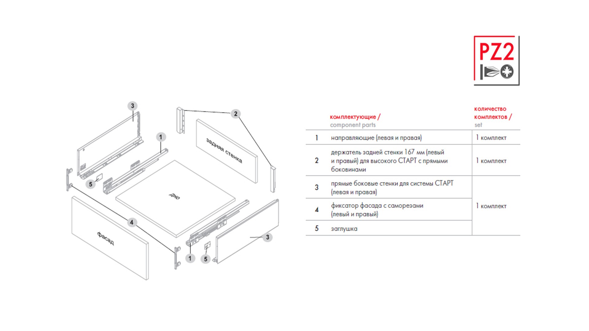 Групповая коробка боковых стенок SBDW11 включает 5 комплектов боковин, а также 5 отдельных пакетов с держателями фасада, декоративными заглушками и необходимым крепежом.