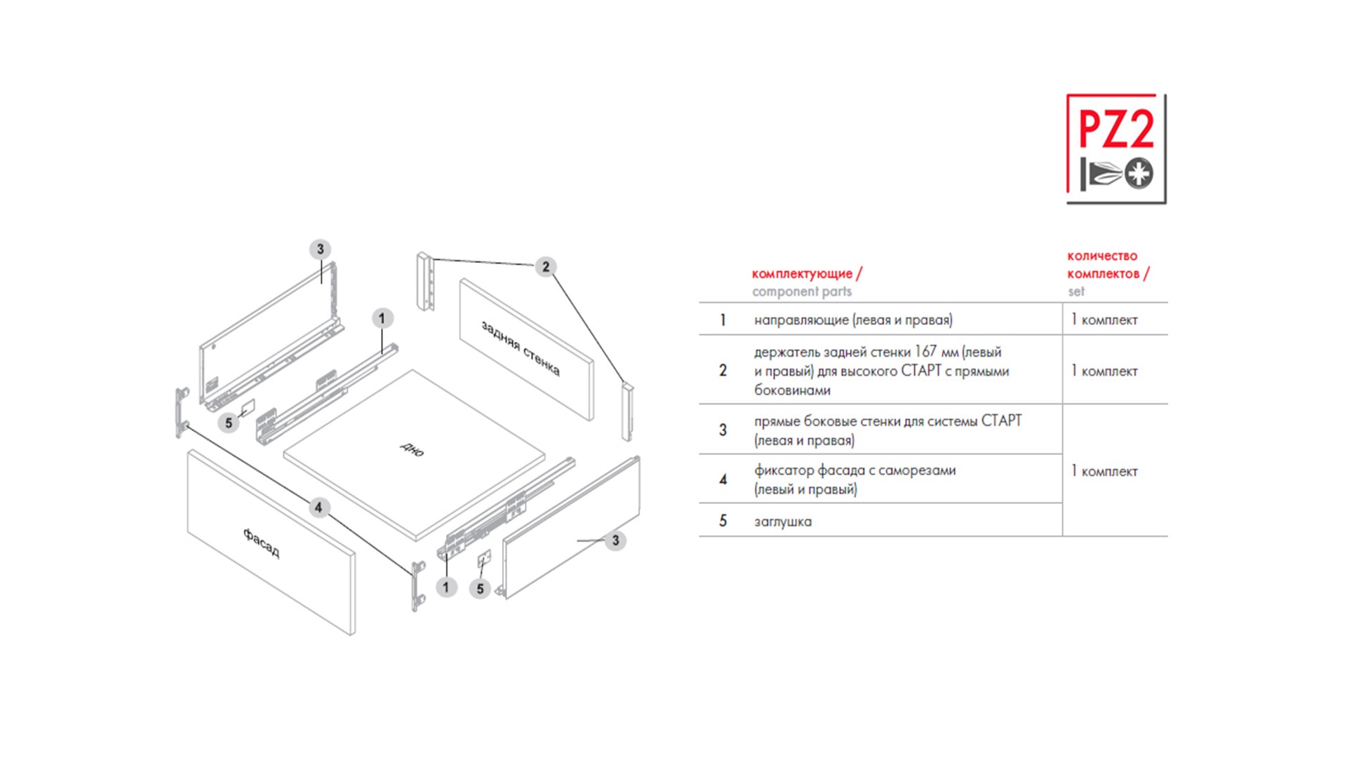 Групповая коробка боковых стенок SBDW11 включает 5 комплектов боковин, а также 5 отдельных пакетов с держателями фасада, декоративными заглушками и необходимым крепежом.