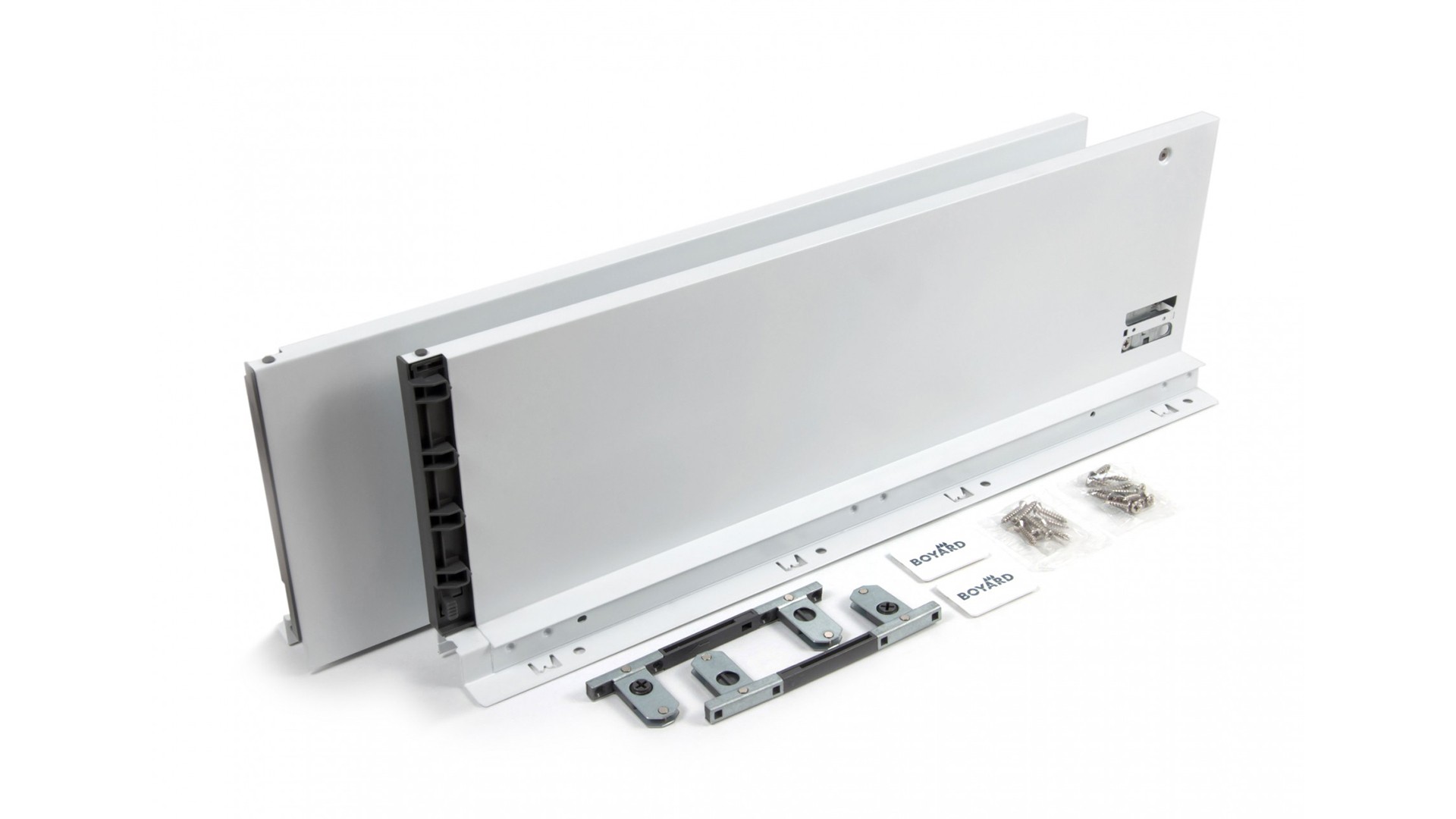 Боковины с держателями задней стенки и фиксаторами фасада выполняют защитно-декоративную функцию, а также соединяют между собой основные элементы выдвижного ящика: передняя фасадная панель, задняя стенка и дно. Кроме этого, боковины выполняют функцию регулировки фасада выдвижного ящика, функцию подвижного крепления выдвижного ящика к опорной направляющей скрытого монтажа DB8181, предварительно установленной на боковой стенке непосредственно мебельного изделия и защищают от непреднамеренного снятия при полном выдвижении механизма. Боковые стенки SBDW13, покрытые порошковой эмалью методом распыления с последующей сушкой при температуре 90 градусов, прослужат весь эксплуатационный срок, даже в условиях агрессивной кухонной среды. В комплект также входят декоративные заглушки с логотипом BOYARD.