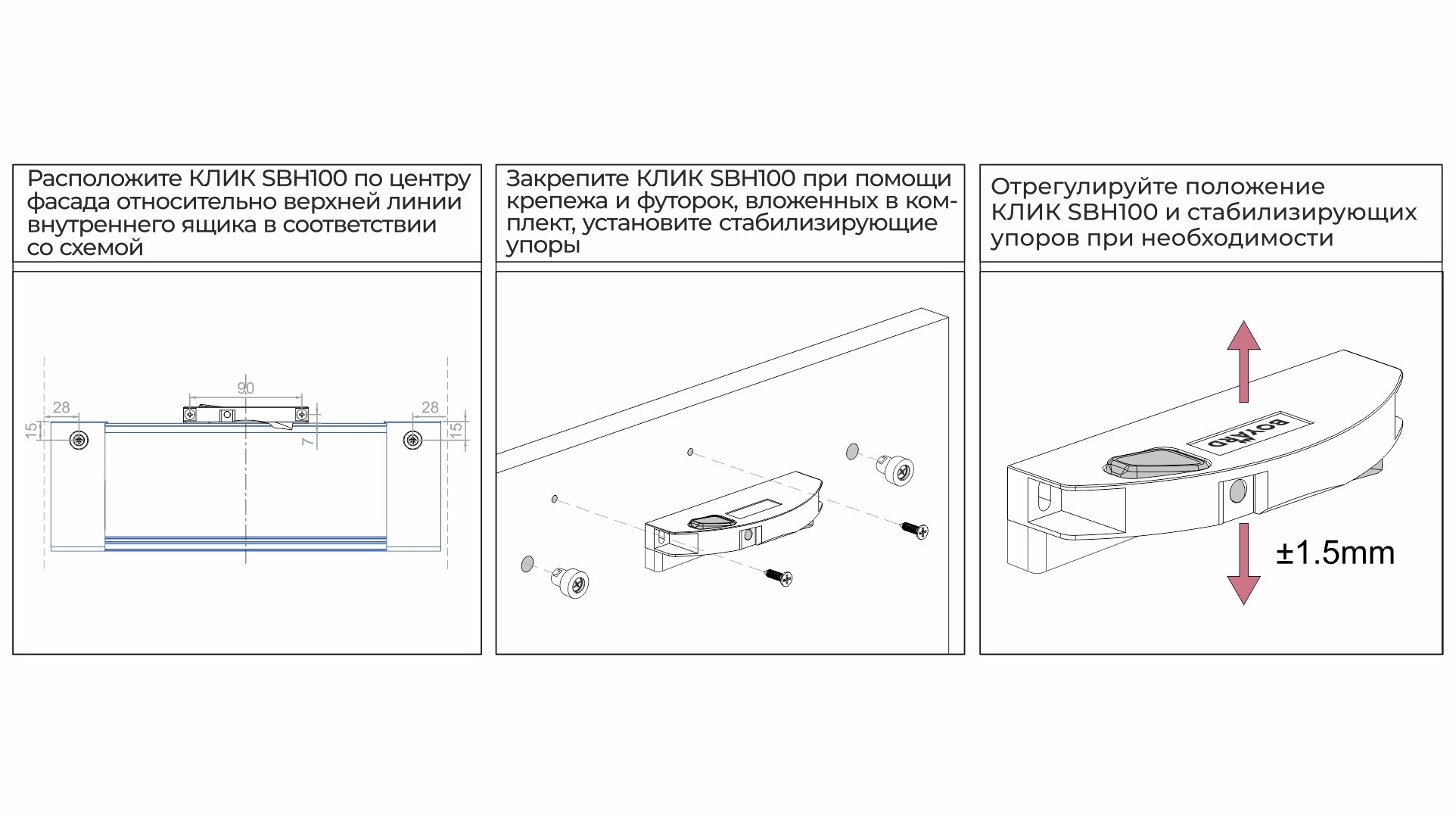 КЛИК SBH100 в своей конструкции имеет специальный «усик», создающий небольшой преднатяг, препятствующий сильному столкновению внутреннего ящика с фасадом основного ящика.