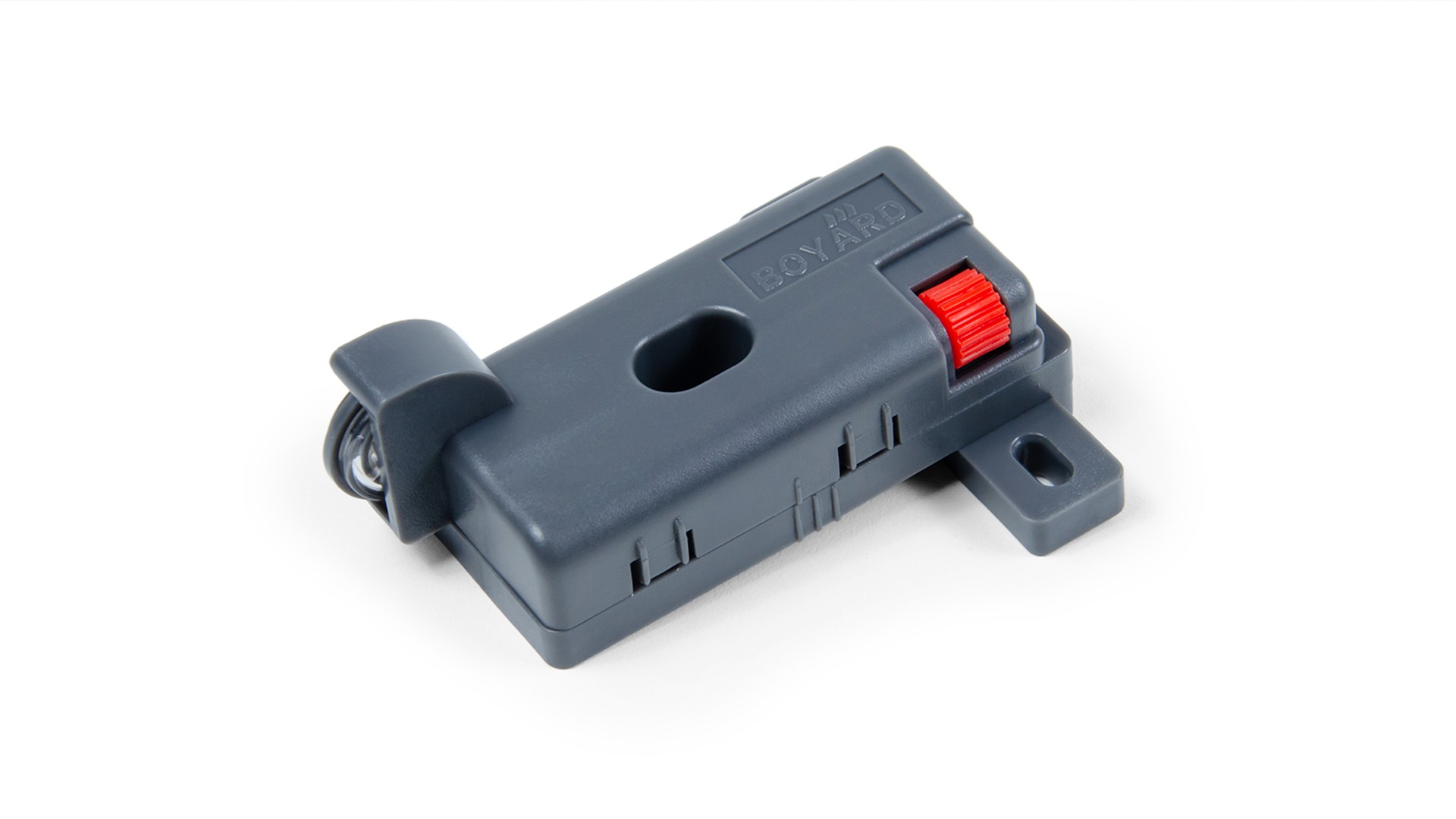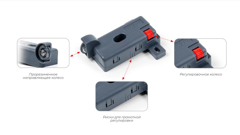 За счёт специального регулировочного колеса красного цвета осуществляется смещение конструкции SBS11 в левом или правом направлении. Прорезиненный обод направляющего колеса обеспечит бесшумную работу стабилизатора. Удобные риски на корпусе изделия позволят установить одинаковое положение стабилизаторов для максимально равномерного и синхронного выдвижения мебельного ящика.