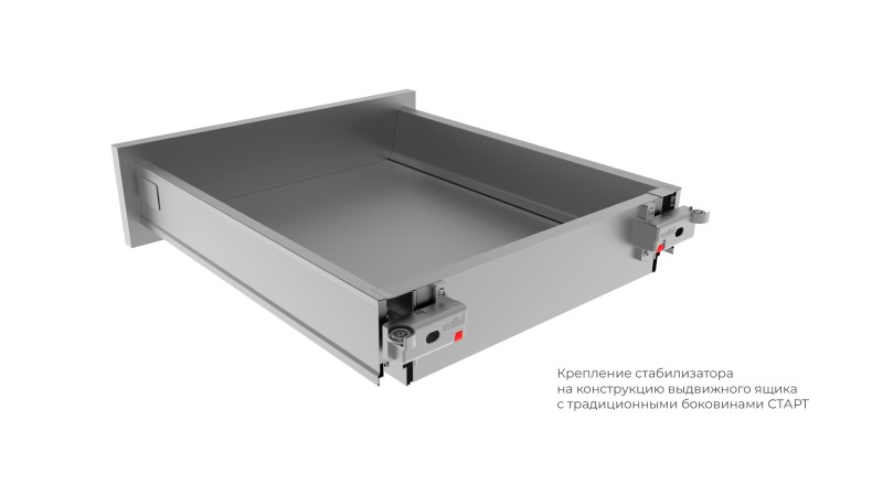 Стабилизатор прост в монтаже: закрепляется с обратной стороны мебельного ящика, что делает его полностью скрытым от глаз.