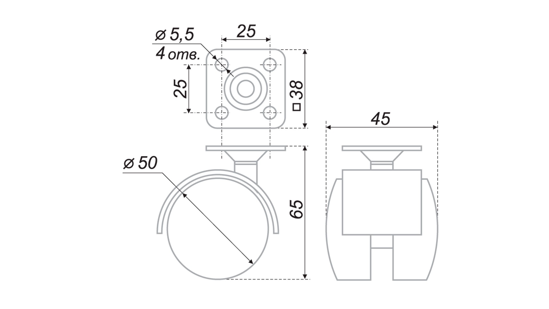N102 - колесо мебельное d=50мм, без тормоза, поворотное, с металлической площадкой для крепления.