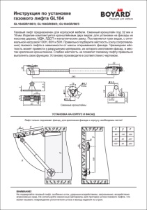 Лифт только поднимает фасад, для крепления фасада к корпусу необходимы петли! УСТАНОВКА НА КОРПУС И ФАСАД Инструкция по установке газового лифта GL104 GL104GR/100/3; GL104GR/80/3; GL104GR/50/3 ВНИМАНИЕ! Не подвергайте газовый лифт, особенно шток, ударным воздействиям, загрязнению, воздействию агрессивных сред. Не используйте смазочные материалы для протирки штока газового лифта, что может вызвать повреждение уплотнителя штока и выход изделия из строя. 1 0 0 9 0 85 x y z о 80 о 9 0 о 100 250 237 230 32 30 x y z 32 1 4 160 y Газовый лифт предназначен для корпусной мебели. Сменный кронштейн под 32 мм и 16мм. Изделие комплектуется кронштейнами двух видов: для установки на фасады из массива дерева, МДФ, ЛДСП и металлические рамы. Поставляется трех видов, с опти- мальной нагрузкой 100Н, 80Н и 50Н. Правильно подберите жёсткость (силу сопротивле- ния) газового лифта в зависимости от массы открываемого фасада. Чрезмерная жёс- ткость может привести к разрушению материала, из которого изготовлен фасад, в мес- тах крепления кронштейнов. Слабая жёсткость не позволит газовому лифту правильно выполнять своюфункцию. Установку производите в соответствии с чертежом. Сменные кронштейны 1 3 , 5 2 2 1,5 18,5 5 1 4 1 7 1 5 32 245 4 ,3 3 отв. 1 9 31 1 2,8 1 9 9,8 50 3 4 1 3,8 4 1 7