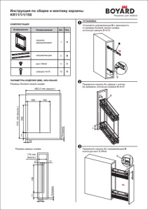 A B корзина двухуровневая C 1 2 1 2 винт М 4 х 6 саморез 4x1 6 4 Размеры дверцы шкафа: Размеры боковой панели шкафа: 392 Толщина 32 m in (внутр.) 482,5 7 1 5 1 8 m in (внутр.) 1 9 5 1 92 Установите направляющие B в зависимости от размера боковой панели шкафа, используя саморез D 4х16 Прикрепите корзину A к дверце с учетом ее размеров, используя саморез D 4x16 Прикрепите корзину A к направляющим B используя винт C М4х6 направляющие D 55 Толщина 71 17 17 392 115 m in (внутр.) B D D 71 55 C Инструкция по сборке и монтажу корзины KR1 1/1/1/ 150 КОМПЛЕКТАЦИЯ 1 Наименование Изображение Шт. 2 3 УСТАНОВКА ПАРАМЕТРЫ ИЗДЕЛИЯ (ММ) : 465х106х485 Поз.